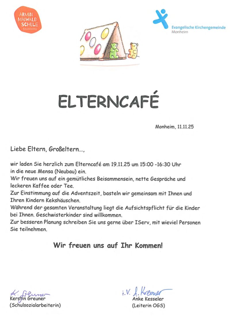 wir laden Sie herzlich zum Elterncafé am 19.11.25 um 15:00 -16:30 Uhr